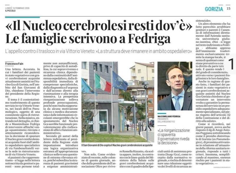 L’articolo pubblicato oggi su “Il Piccolo” sul Nucleo Gravi cerebrolesioni acquisite di Gorizia non è una semplice cronaca locale, la fotografia di decisioni puramente a carattere amministrativo che impattano sui fragili senza alcun fondamento clinico e senza mai coinvolgere le famiglie. Famiglie che si sono rivolte al Presidente della nostra Regione per chiedere che il reparto altamente specializzato rimanga inserito in ambito ospedaliero. Non lo fanno per puro conservatorismo, neppure per resistenza al cambiamento, ma per una ragione essenziale e non negoziabile: la tutela della salute e della sicurezza di persone estremamente fragili. punto centrale, che l’articolo evidenzia con chiarezza, è che non esiste una motivazione clinica documentata che giustifichi il trasferimento, al contrario, le norme e le linee guida assistenziali indicano esplicitamente la necessità di un contesto ospedaliero che garantisca accesso e continuità immediata a competenze specialistiche e sicurezza clinica in situazioni ad altissimo rischio. In questo quadro, parlare genericamente di “riorganizzazione” o di “razionalizzazione” é di estrema superficialità. Quando si interviene su reparti che assistono pazienti privi di voce e di possibilità di autodifesa, ogni scelta deve essere sorretta da evidenze sanitarie, non da esigenze amministrative. Questa vicenda non nasce oggi, é il risultato di un lavoro di ascolto delle famiglie, di studio delle normative, di confronto con gli operatori sanitari, di ricostruzione puntuale delle criticità. C’è poi un aspetto inaccettabile: quando le famiglie scoprono cambiamenti così rilevanti attraverso voci informali o articoli di giornale, senza un’informazione diretta e trasparente, si rompe il patto di fiducia tra istituzioni e cittadini. Questo non è uno scontro politico, né una polemica sterile, é una richiesta di responsabilità istituzionale: fermarsi, rivedere le decisioni, verificare l’impatto reale sui pazienti, correggere ciò che non regge sul piano clinico ed etico fa parte dell’esercizio della pratica democratica tra i decisori politici e i cittadini, poiché il grado di civiltà di un Paese si misura anche da come tratta chi non può difendersi, chi non può scegliere, chi dipende totalmente dalle decisioni degli altri.