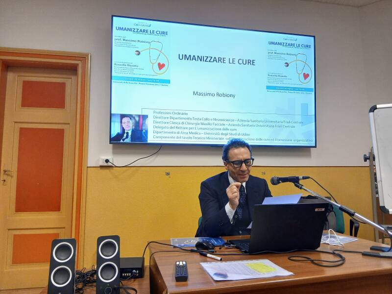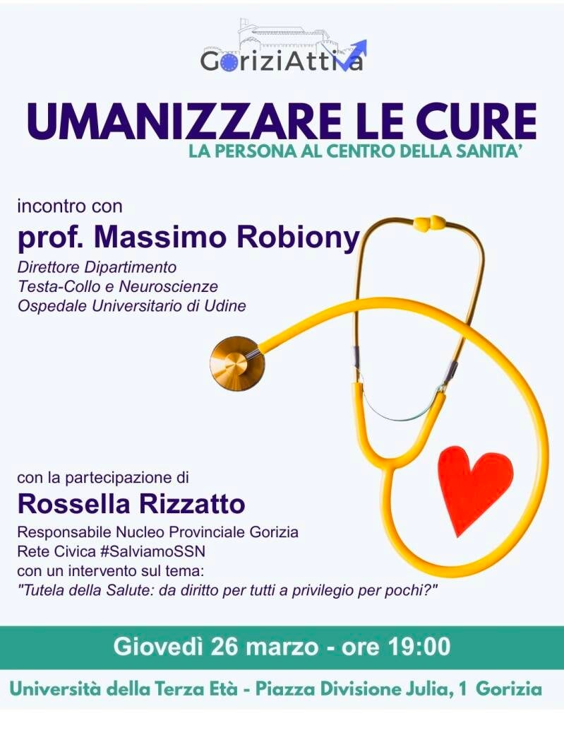 Giovedì 26 marzo, presso la Sala conferenze dell'Università della Terza Età di Gorizia, la nostra associazione ha organizzato un incontro che ha visto la partecipazione del prof. Massimo Robiony, Ordinario della Facoltà di Medicina e Chirurgia dell'Università degli Studi di Udine e della dott.ssa Rossella Rizzatto, Responsabile del Nucleo Provinciale di Gorizia della Rete Civica #SalviamoSSN. La relazione principale è stata quella del prof. Robiony che ha illustrato la filosofia su cui poggia la Carta di Udine che promuove l'umanizzazione delle cure quale bussola per orientare la transizione della Sanità italiana verso un modello che possa coniugare i principi della nostra Costituzione con l'innovazione e un approccio culturale e organizzativo che abbia al centro il paziente e il benessere di questo e degli operatori.
